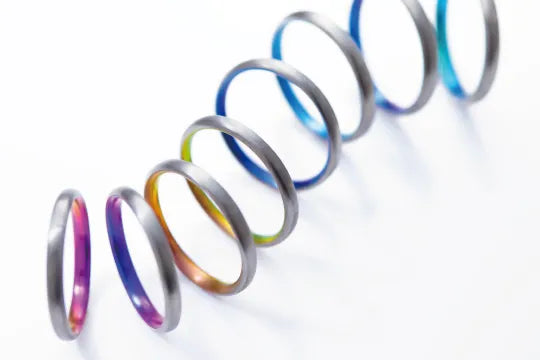 この発色は、金属の表面に極薄の酸化皮膜をつくり、光の干渉によって色を見せる技術。染色や塗装では出せない、金属そのものが放つ透明感と奥行きのある色合いが特徴です。